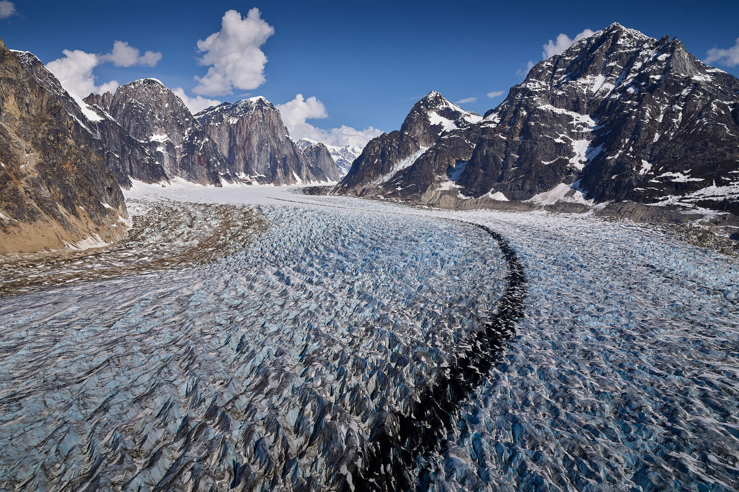 Some summers, meltwater carves deep channels through the glacier surface. They’re rare and constantly changing. Pilots need to know where one is forming—and even then, it might be gone by next week. This one was found on Colony Glacier on a July flight.