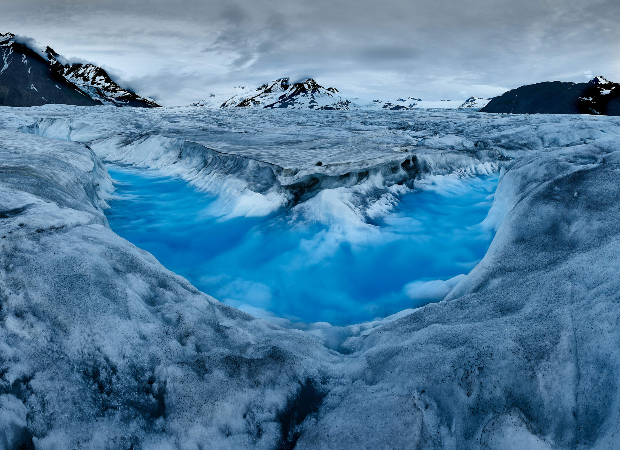 The pools are typically present all summer, year-round actually they just freeze in the winter. They are typically melted out and accessible from mid-May to September, weather dependent. Helicopters can land on the glacier and let you walk right up to the edge of these pools—or even stand on the narrow islands between them, depending on conditions.