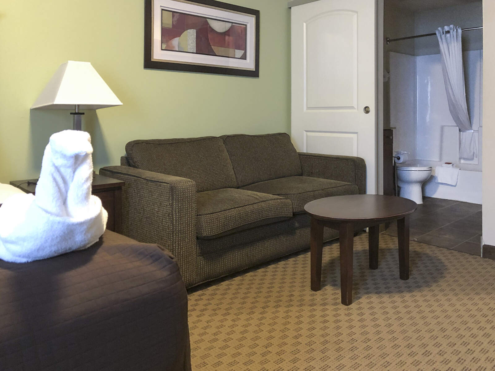 Choose from a suite with a single queen-size bed and pull-out sofa bed, or one with two queen-size beds. Kitchenettes include pots, pans, dishes, fridge and freezer, stovetop, microwave, sink, and coffee maker, with coffee from a roaster from Juneau.