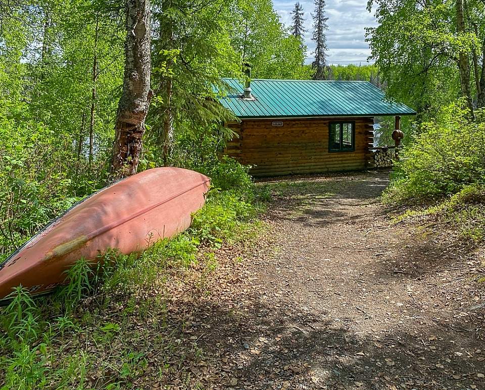 Drive to the parking lot at Mile 2.5 of Nancy Lake Parkway, then take the half-mile walking trail down to the cabin. Be prepared to encounter bears and moose. Canoes are often stashed at the lakeside and can be rented from Tippecanoe Rentals in Willow: 907-355-6687. Here is a good PDF map of the area.
