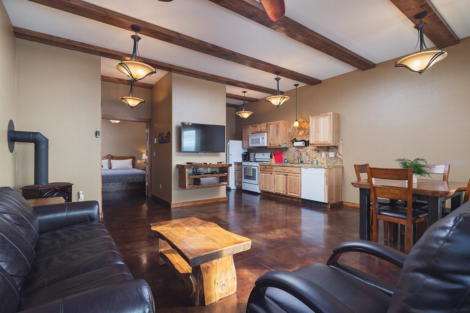 Perched above the bluff with a private balcony, this 1-bedroom cabin has1 king-size bed, a second-story deck with panoramic views, and a gas fireplace.There’s a shared outdoor firepit, horseshoe pit, and sitting area with Fireweed.