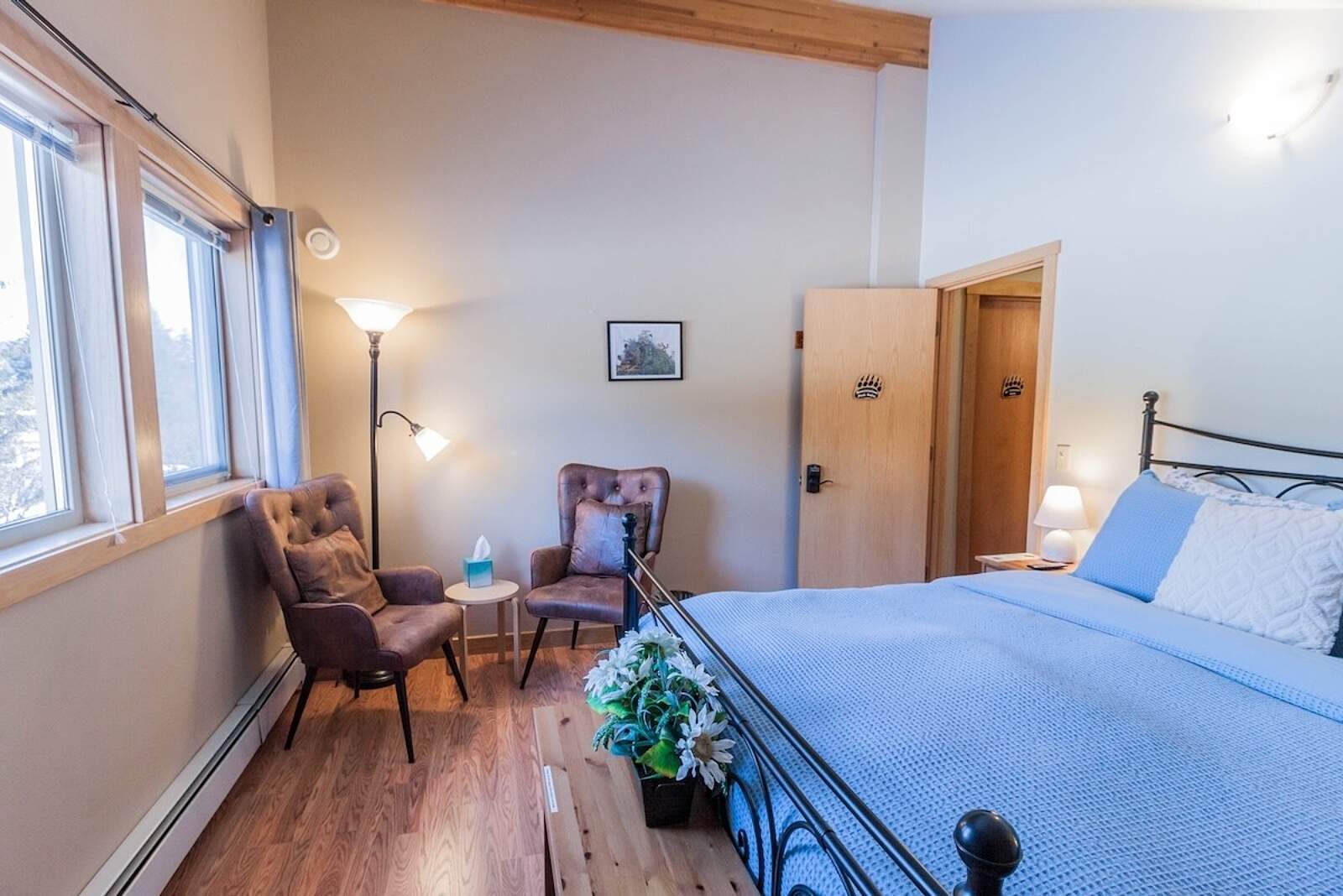 This third-floor room has spectacular views of both Resurrection Peak and Bear Lake. The wrought iron-accented décor has made it a guest favorite year-round. The queen bed has a memory foam topper and luxury linens. The full private bathroom is non-adjoining but just two steps across the hall. Sleeps 2.