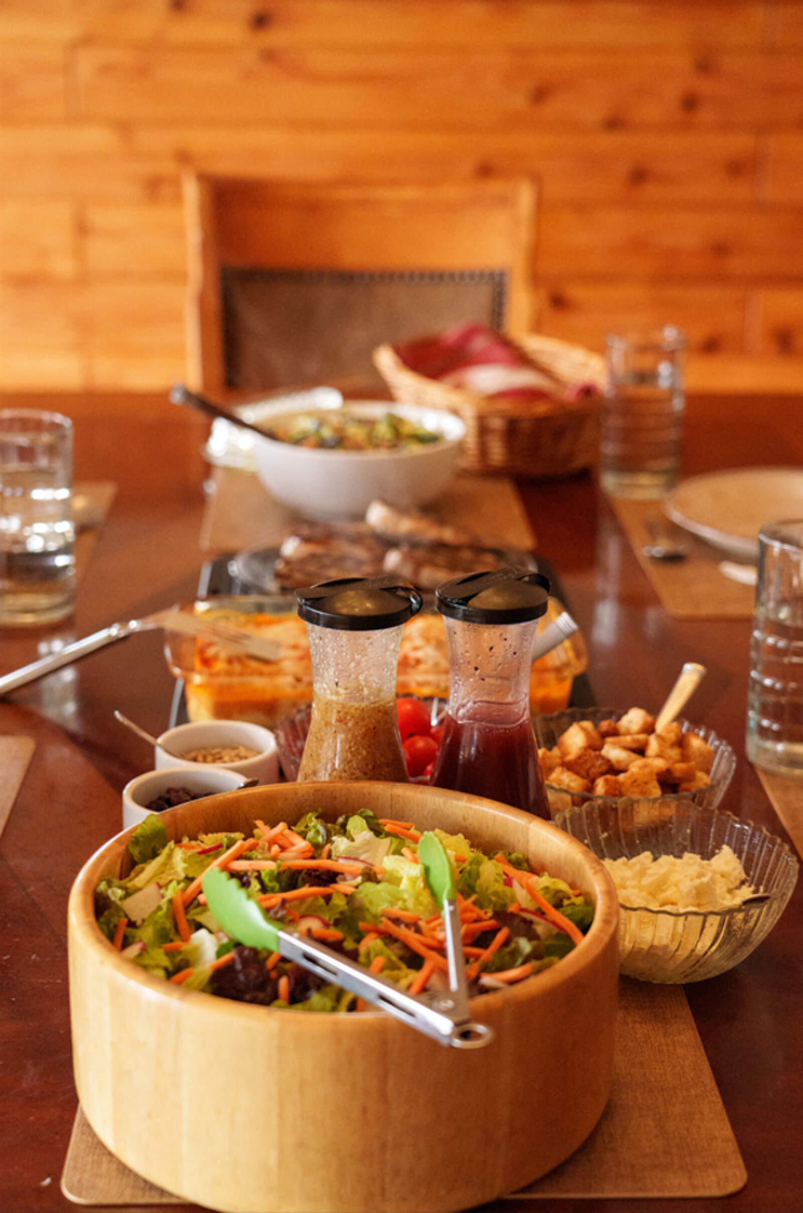 The lodge is comprised of three main guest cabins with enough room for three couples, or even three families, if you ask for extra beds. Otherwise, cabins have both a king bed or two twin bed options. The crisply tidy little houses feel warm and inviting, with quilts on the beds and wood paneling from the floor to the ceiling.