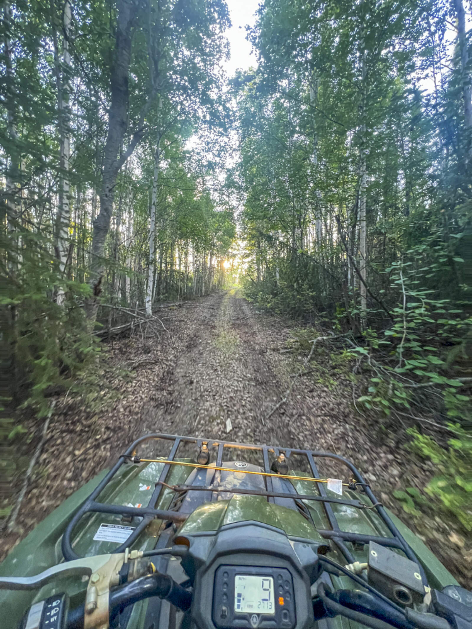 You’ll start by meeting in a rustic, dry cabin, around 10 miles north from downtown Fairbanks, where you’ll meet the team and get fitted with all gear: buff/handkerchiefs, riding gloves, helmet, goggles. After an introduction to the machine—a single-driver Yamaha Kodiak ATV—you’ll set off.