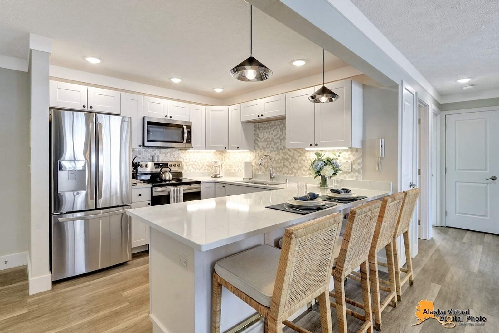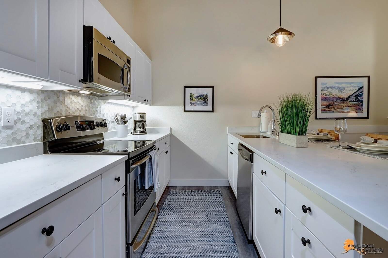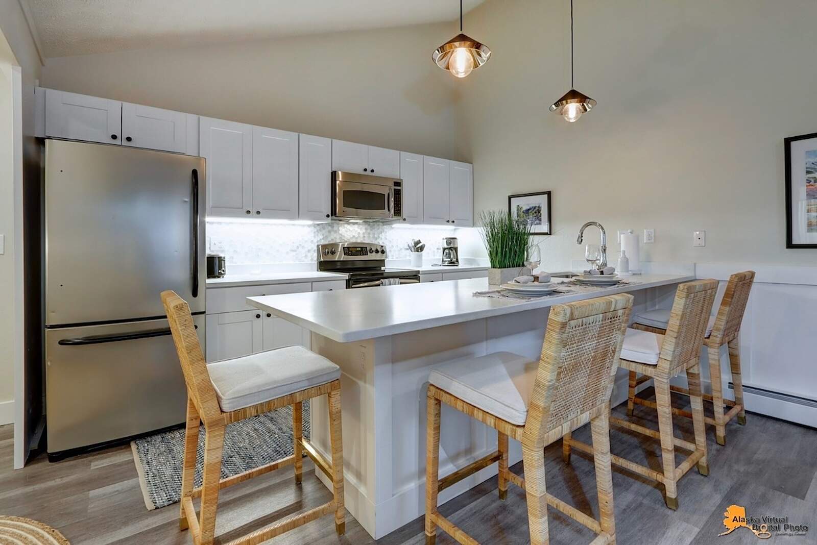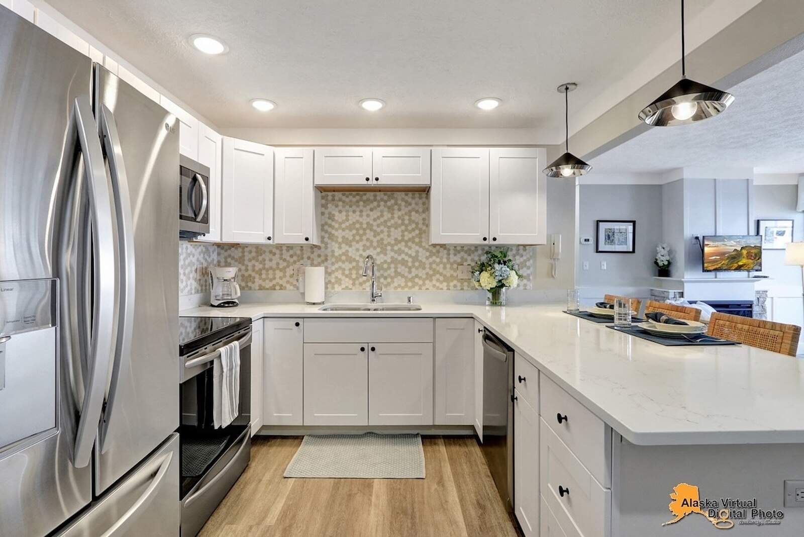 Fully equipped kitchens come with quartz countertops, dishwasher, fridge, oven, microwave, blender, dishes, and silverware—even complimentary, locally roasted coffee. Grocery stores and restaurants are nearby, with downtown Anchorage’s world-class eateries a short drive away.