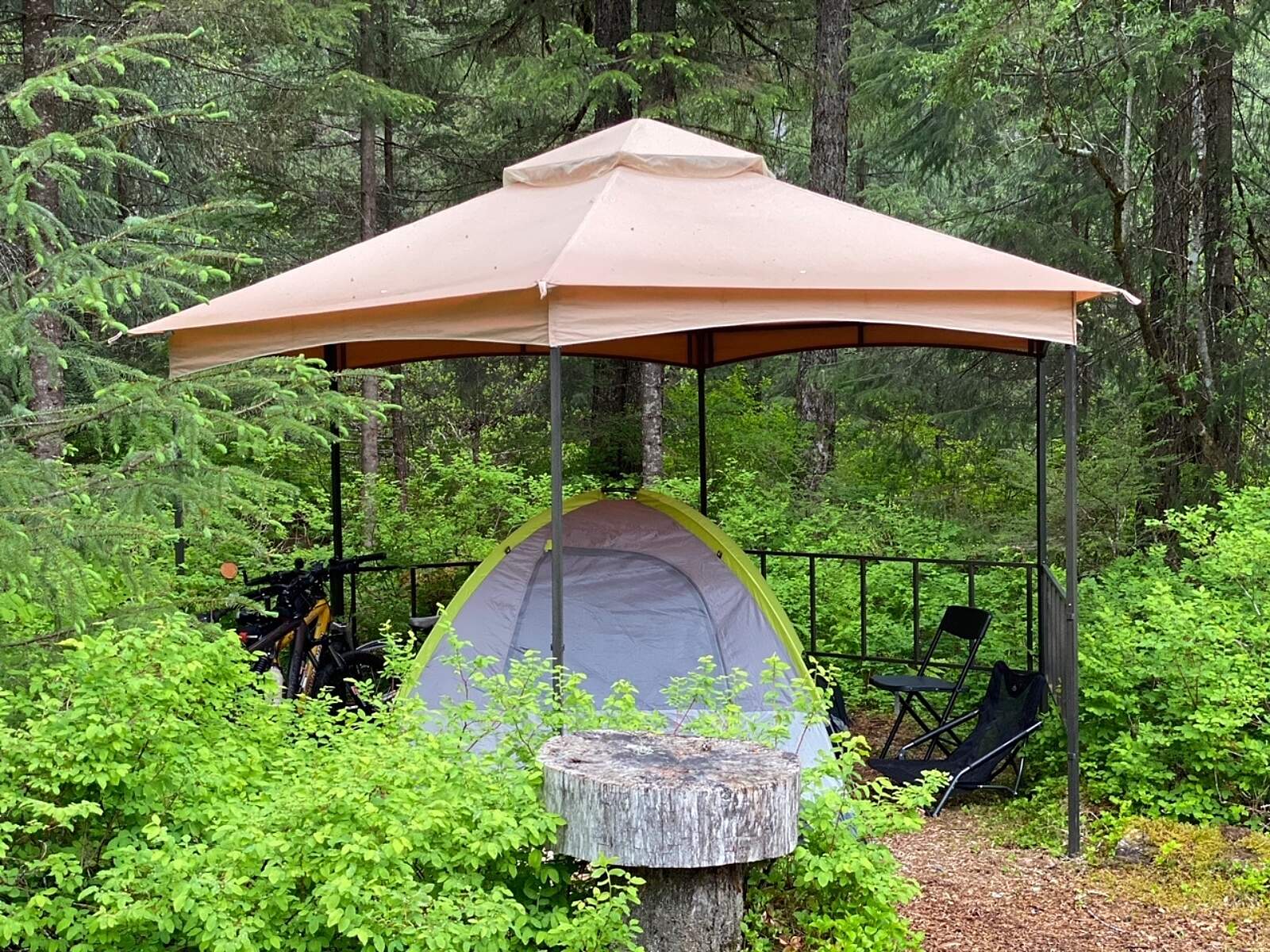 Deluxe Tent Sites: Private site with a covered gazebo, fire pit, picnic table, and onsite parking, access to restrooms, showers, free Wi-Fi.