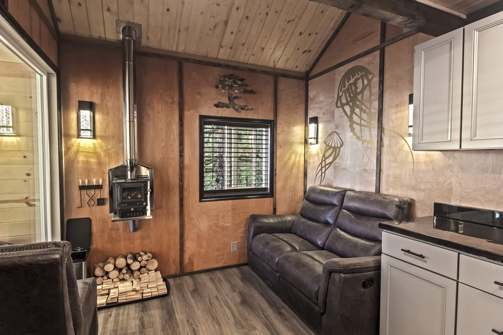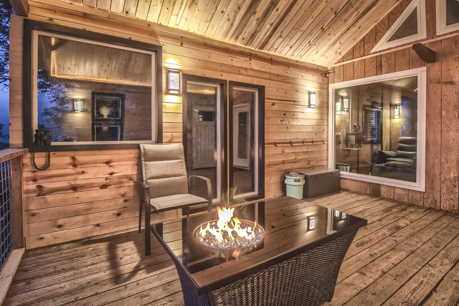 The Ledge: This intimate, 2-person cabin, set on a 1,500-foot bluff, has a cooktop, cookware, small wood stove, and a loft bed. Outside, you’ll find a partially enclosed porch and propane firepit.