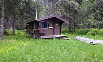 2 single plywood bunks, 2 double plywood bunks, Wood stove, Wooden table and benches, Broom, Outhouse toilet, Woodshed (wood provided), Splitting maul, Skiff and oars (NO personal flotation devices provided). Water available from stream behind cabin. Treat all water before using.