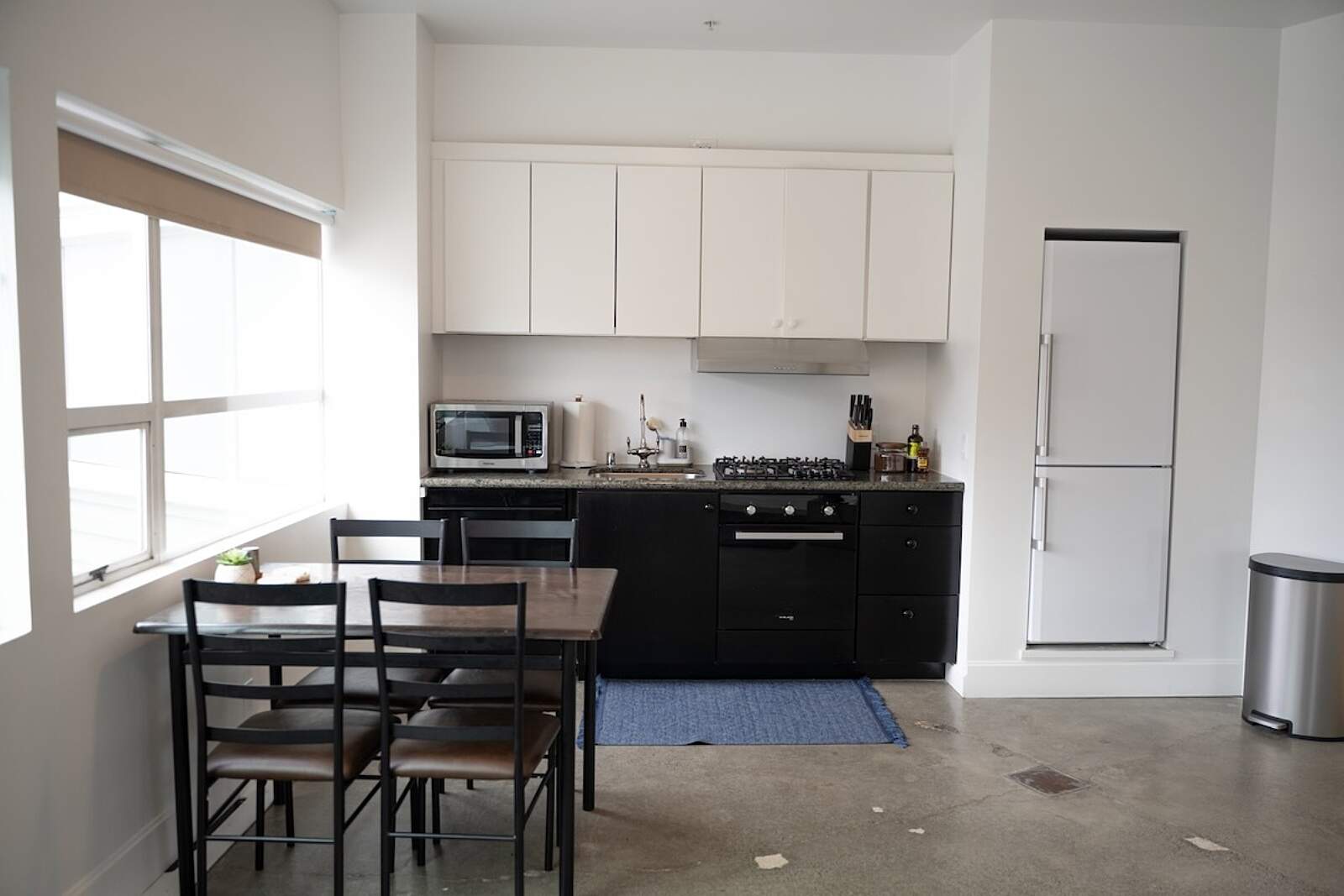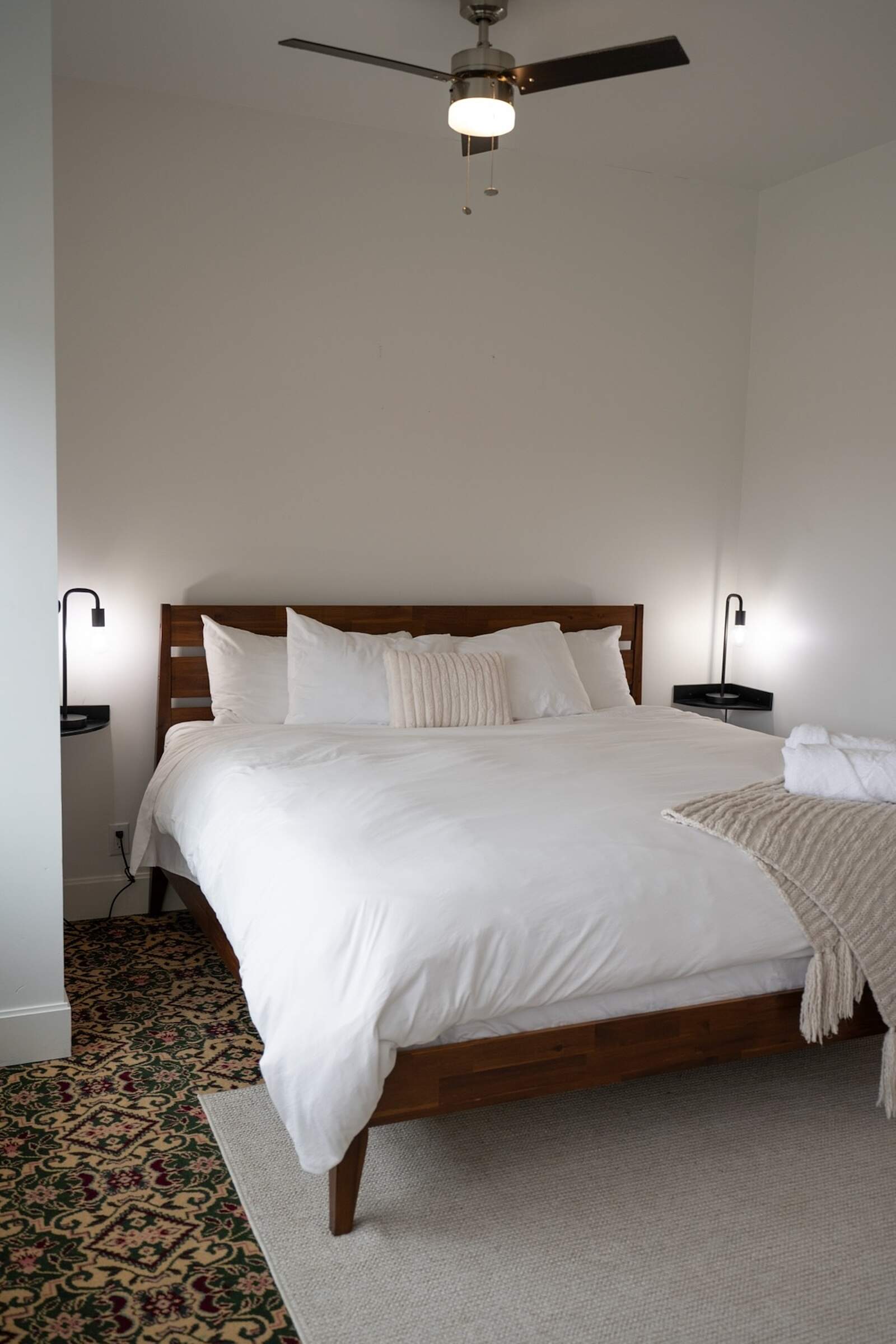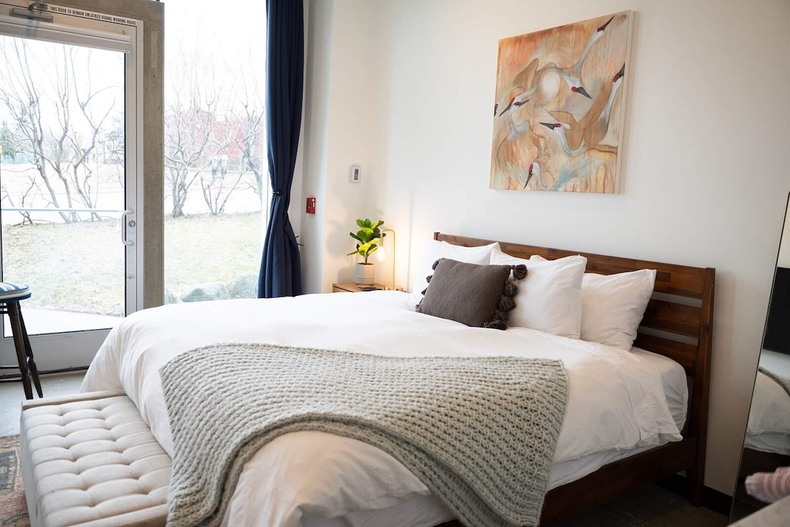 The two-bedroom lofts, which sleep up to six, have a primary bedroom with king-size bed, secondary bedroom with a queen-size bed, and queen-size sleeper sofa, as well as a dining area and large windows