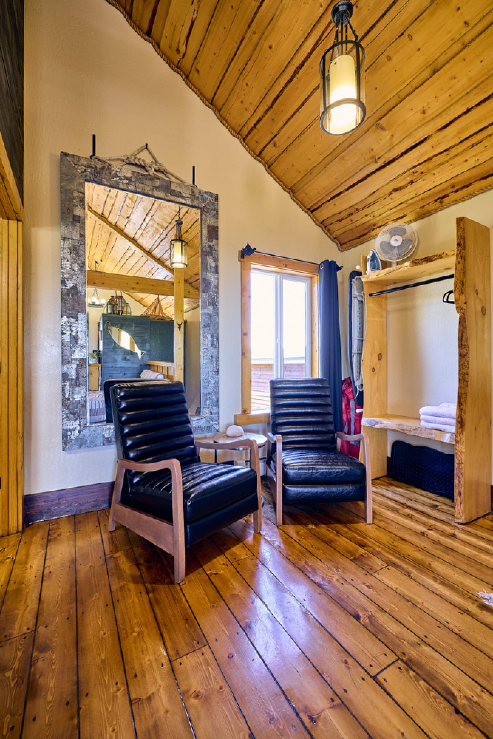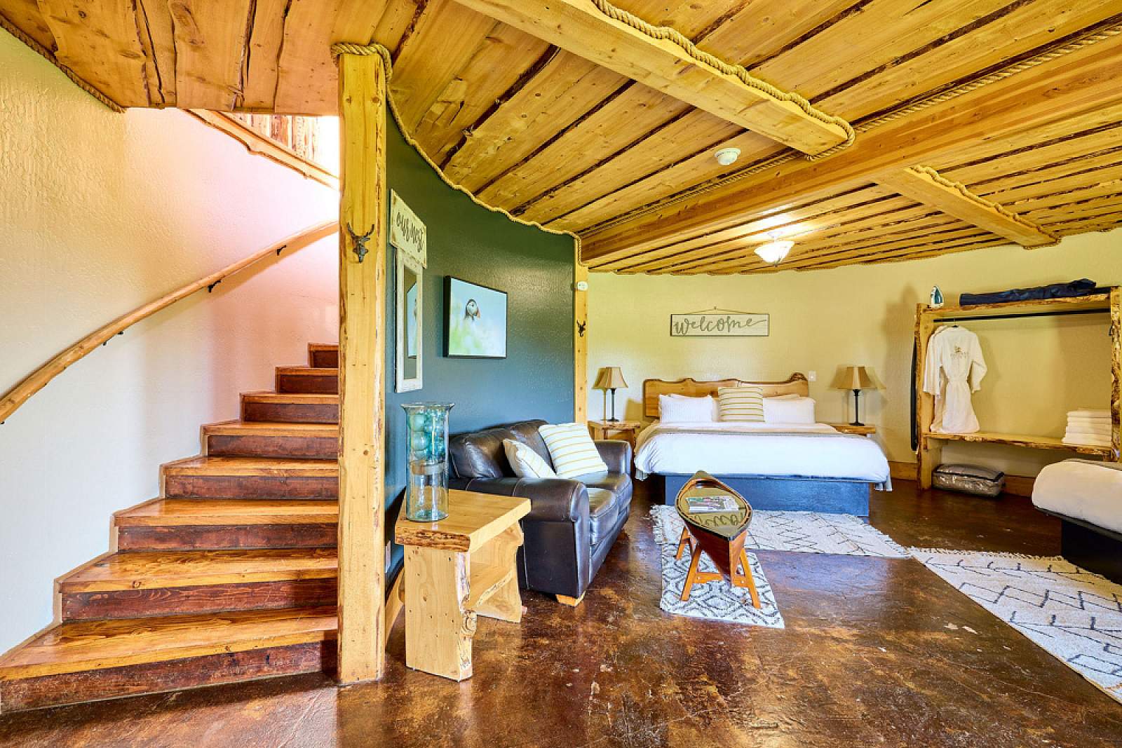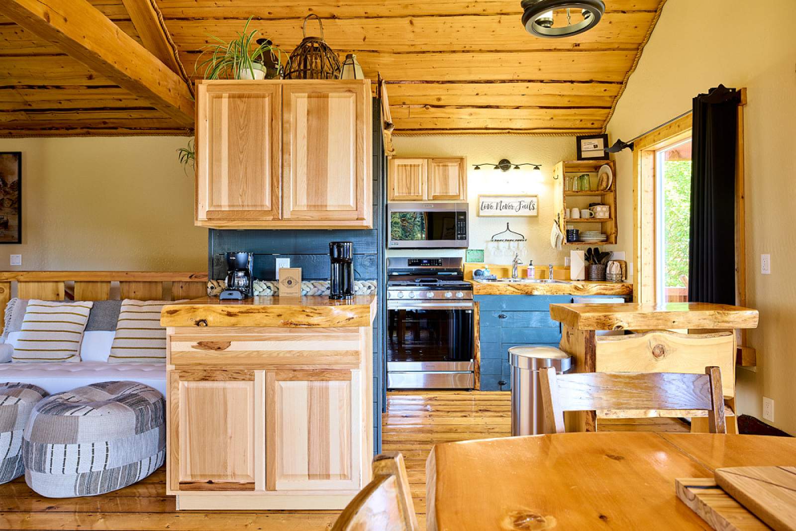 Refreshed in 2025, the resort features just 5 cabins, ranging from more traditional options to subterranean “hobbit-style” suites built into the hillside. Each comes with a full kitchen or kitchenette and its own outdoor deck with seating; some also have gas fireplaces.