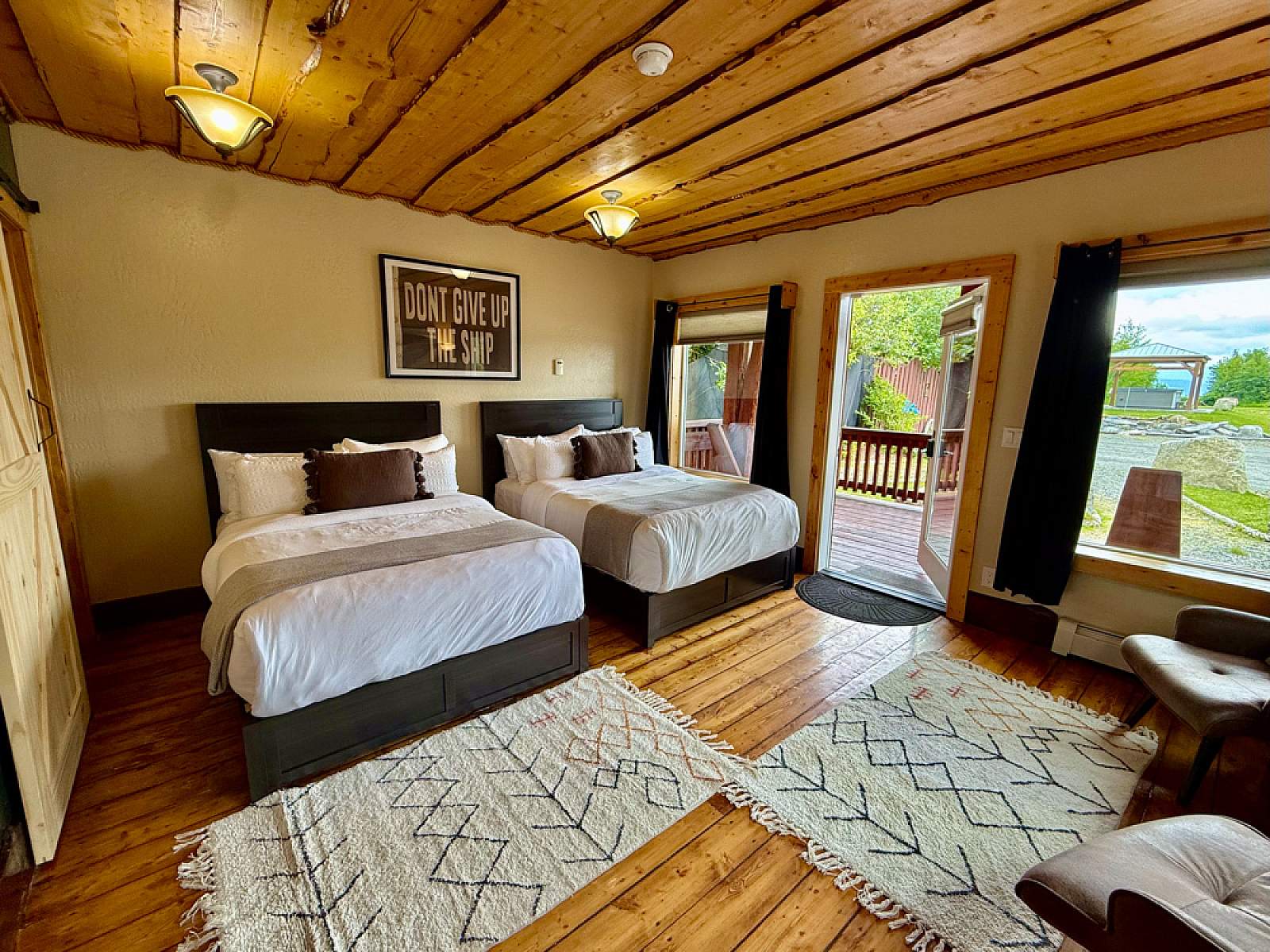 A unique subterranean suite, The Cove features curved ceilings, ocean views, kitchenette, and a private deck with BBQ and firepit. You’ll find 1 king-size bed, 1 full-size bed, and 1 queen-size sleeper sofa.