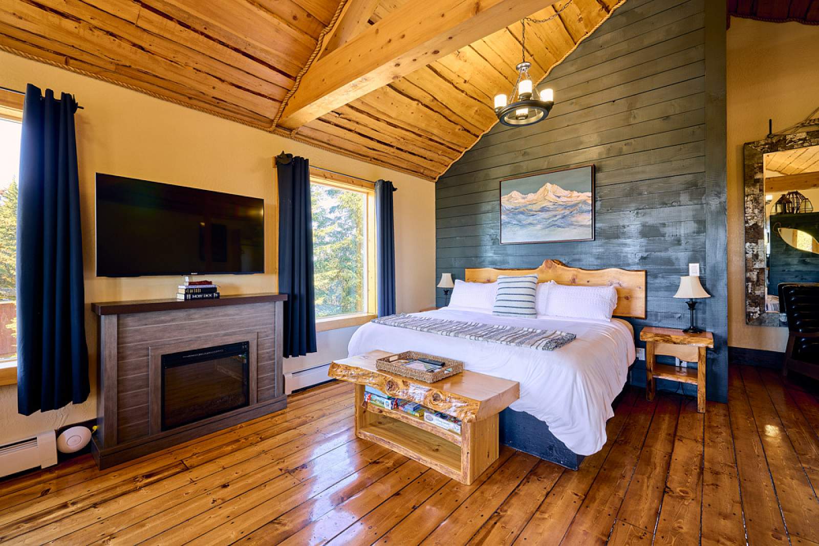 Ideal for families or small groups, this multi-level suite comes with a full kitchen, dining area, and bedroom with king-size bed on the upper floor, with 2 full-size beds, a half-bath, and a washer/dryer downstairs There’s also an electric fireplace.