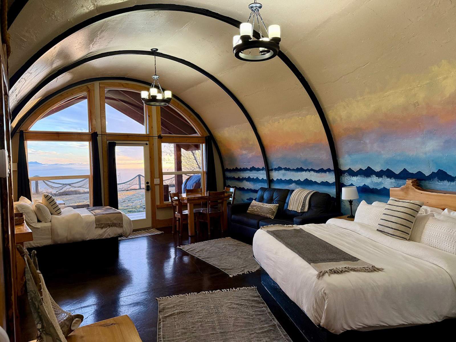 Built into the hillside with a distinctive curved ceiling, this suite features ocean views, a private deck, and covered firepit seating area. There’s a kitchenette and space for up to 6, with 1 king-size bed, 1 full, and 1 queen-size sleeper sofa.