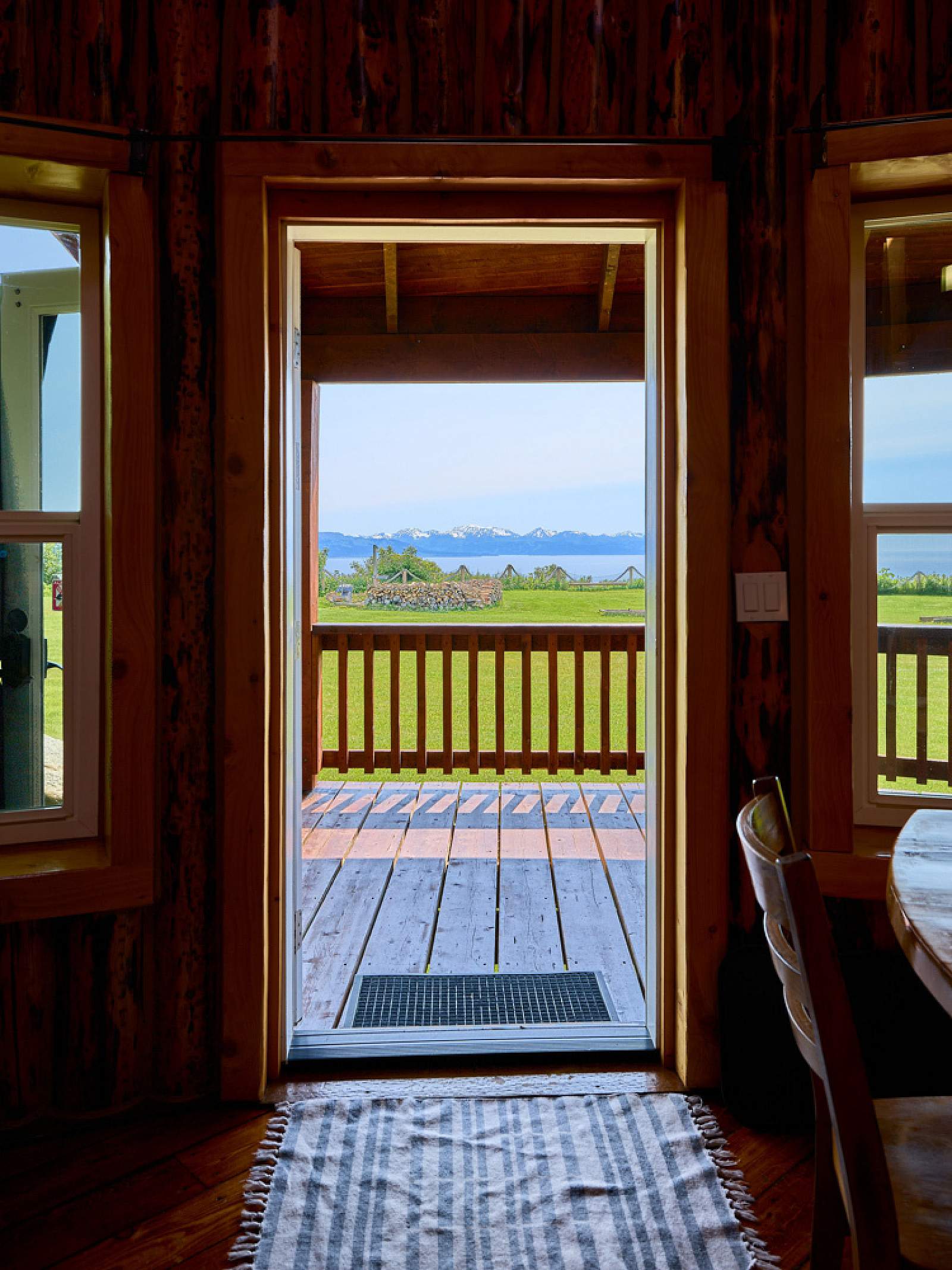 This 2-story round-log cabin comes with a skylight, kitchenette, BBQ, and gas fireplace. There are 2 king-size beds downstairs, and a queen-size sleeper sofa upstairs. There’s also a private deck with seating and a view of the bay.