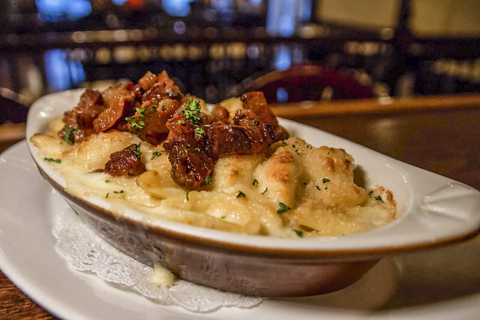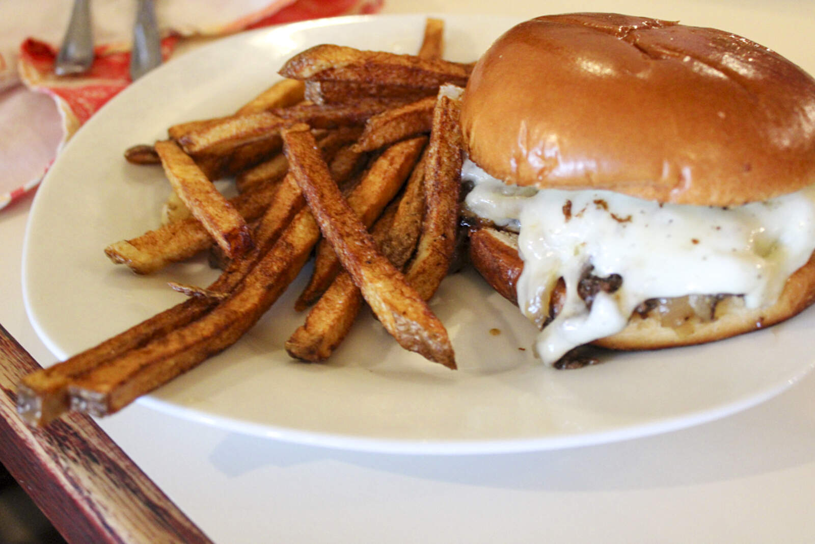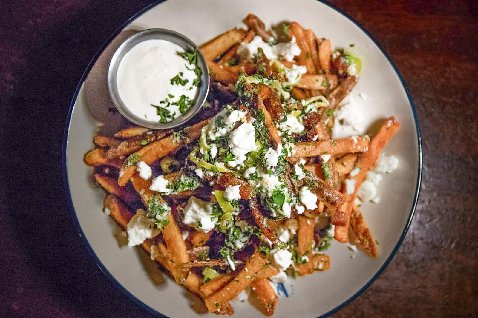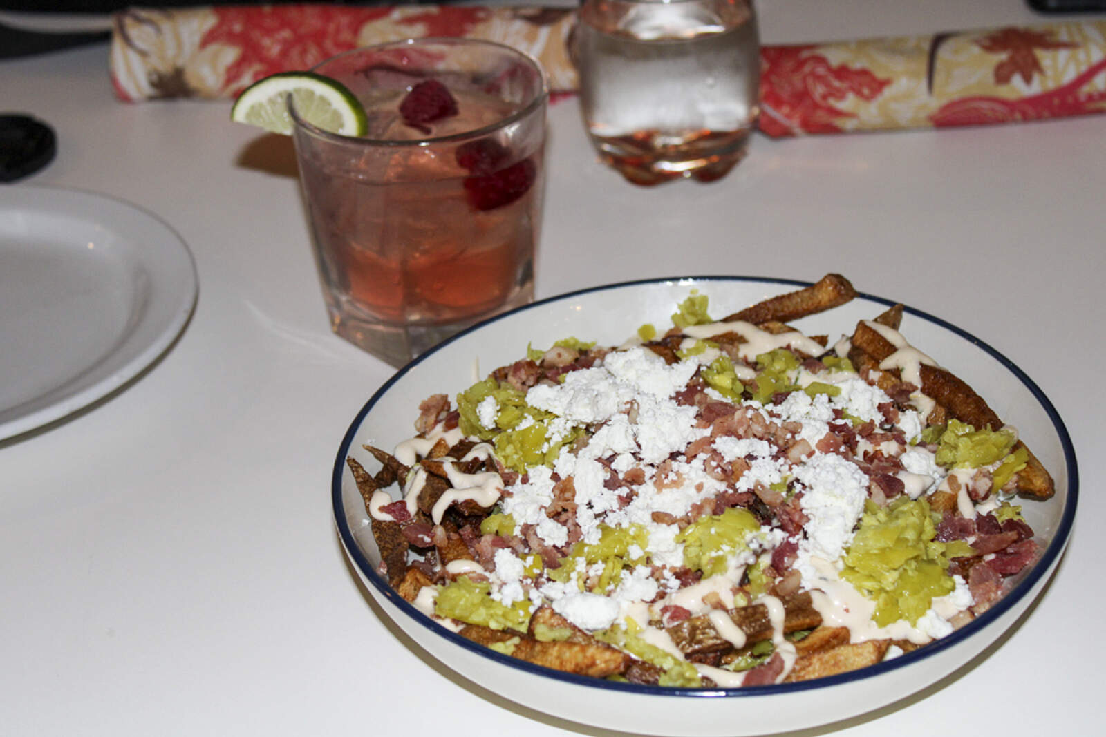 The menu features dishes like seafood chowder, halibut and salmon sandwiches, soups, salads, and loaded fries, along with a full bar. A kid’s menu is also available.