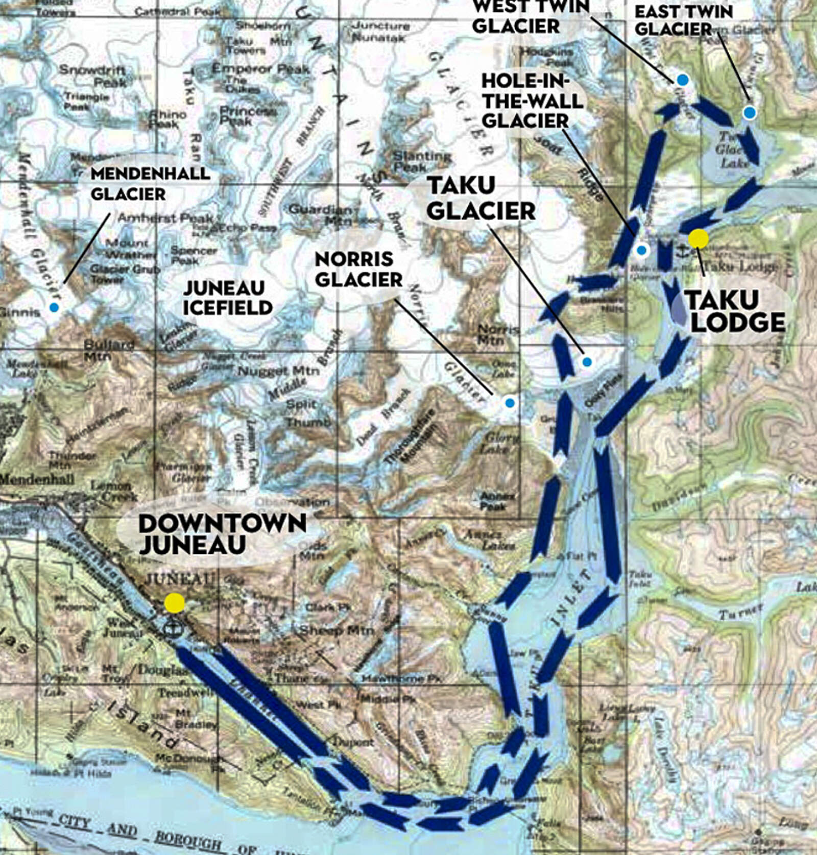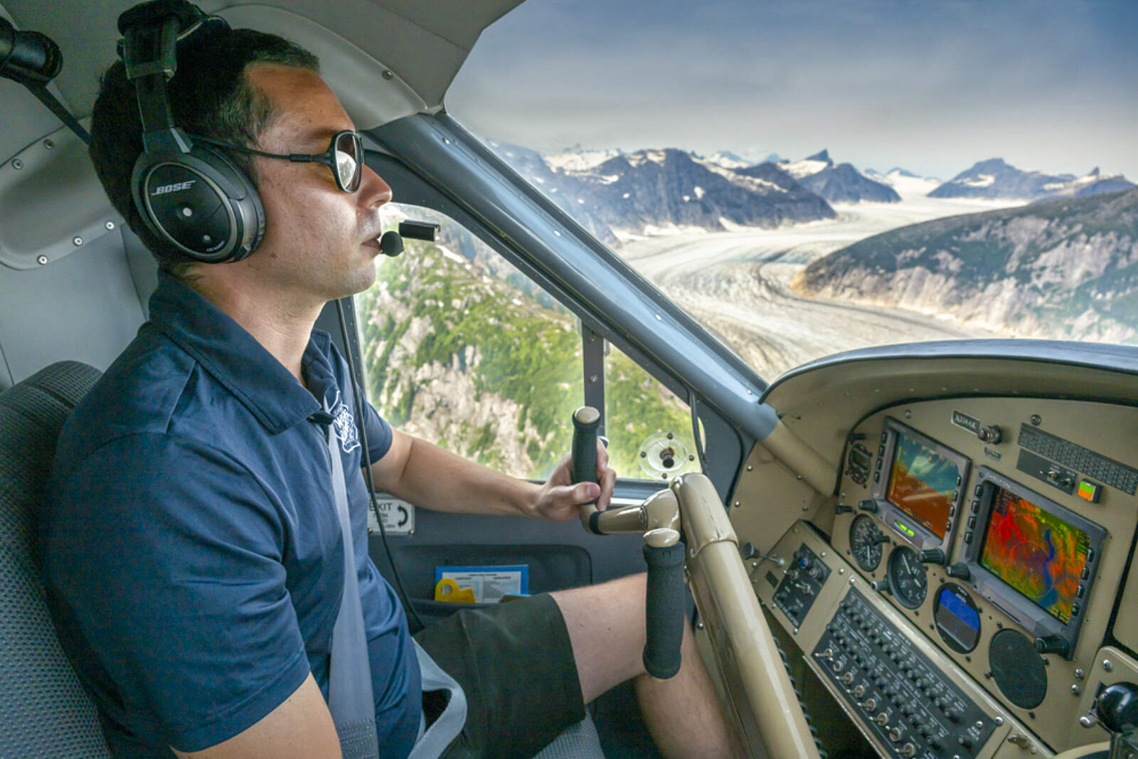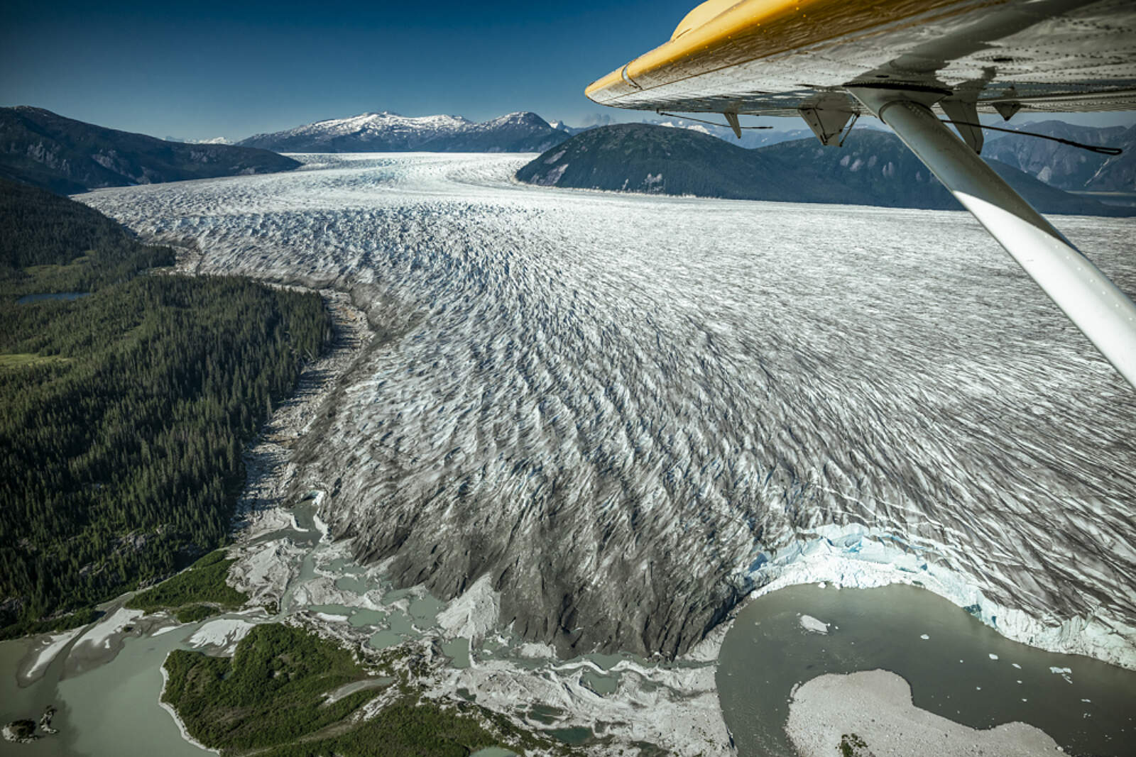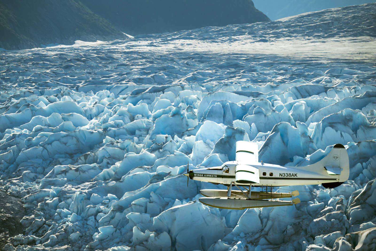 As you fly, everyone gets a headset with a recorded narration on the wilderness landscape and the history that has made this area so special. This allows the Wings Airways pilots to devote all of their attention to the safety of your flight. You’ll fly through the Inside Passage and a network of islands, glacier carved mountains, rugged coastline, green alpine slopes (keep a lookout for mountain goats), and fly over five massive glaciers: Norris, Taku (the only advancing glacier in the Juneau Icefield), East Twin, West Twin, and Hole-in-the-Wall. Peer down into deep blue crevasses or snap photos of jagged, towering columns of ice.