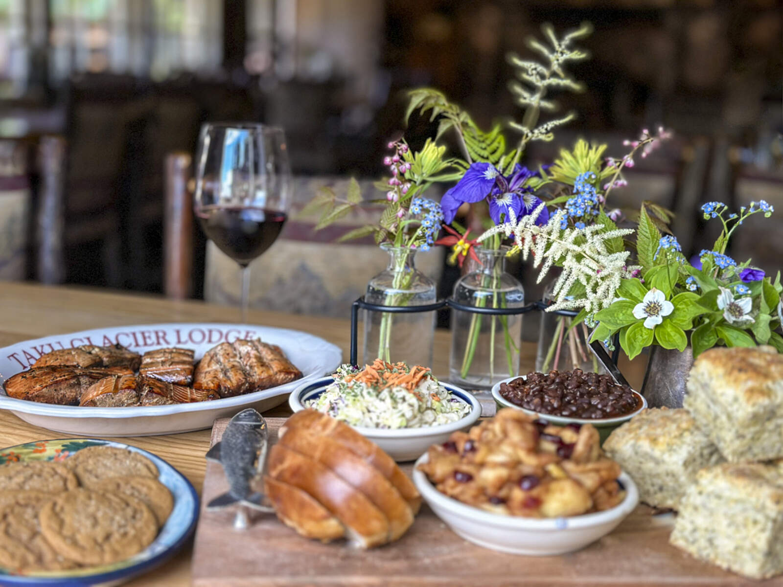 The flight touches down on the Taku River, just across from a glacier and in front of the Taku Lodge. On the registry of National Historic Places, this elegantly rustic lodge was built in 1923 by a prominent Juneau physician. After a brief bear orientation (black bears frequent the area), you’ll sit down to a feast of fresh, wild Alaskan King salmon grilled on an alder wood fire. There are plenty of tasty sides, all cooked fresh and made from scratch.
